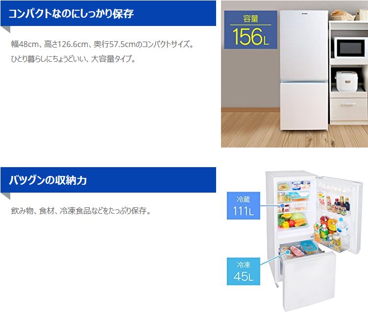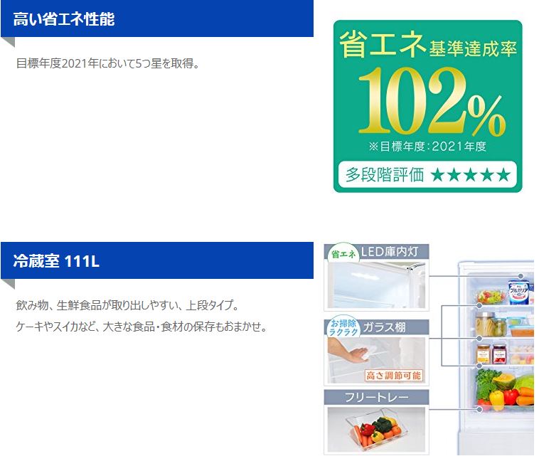 ■種類ノンフロン冷凍冷蔵庫■定格内容積全体:156L冷蔵室:111L<96L>、うちフリートレー<17L>冷凍室:45L<32L>※<>内数字は、「食品収納スペースの目安」です。